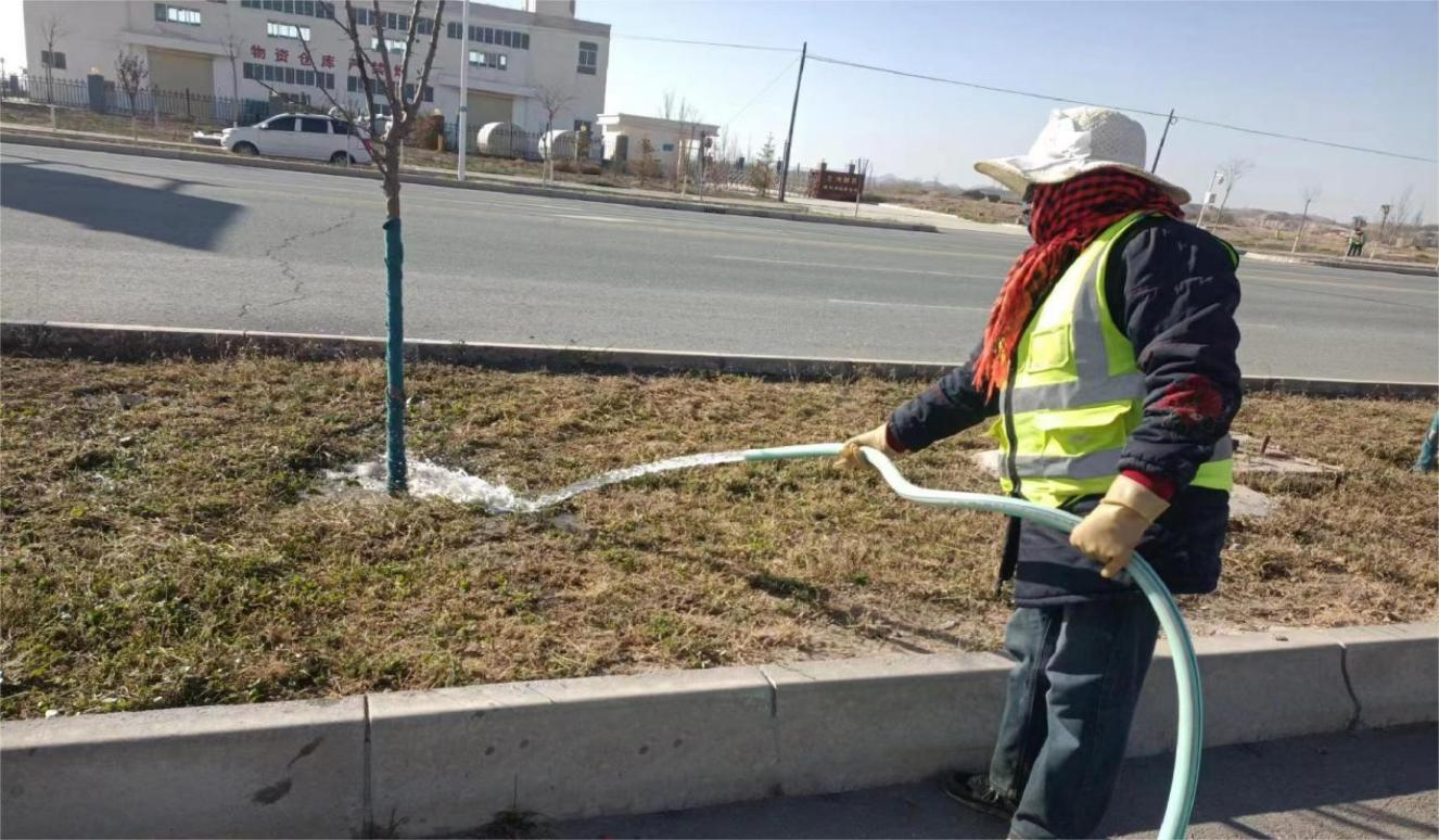 冬灌采用水車澆灌、人工澆灌、噴灌等多種形式確保水分充分滲透到土壤中。同時,加大巡查力度,采取實地抽樣檢查冬灌滲水深度,對澆灌不徹底和過度灌溉的綠地要求立即進行整改,確保每塊綠地澆灌徹底,使苗木吸收到充足水分,對新栽植的苗木結(jié)合封凍水在樹木根部培起土堆加強其保溫、保濕效果,目前冬灌正在有序進行中。